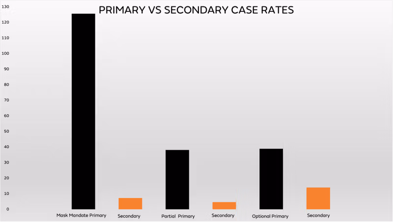 Kao što je gore navedeno, stope primarnih infekcija bile su znatno veće u okruzima s obveznim nošenjem maski.