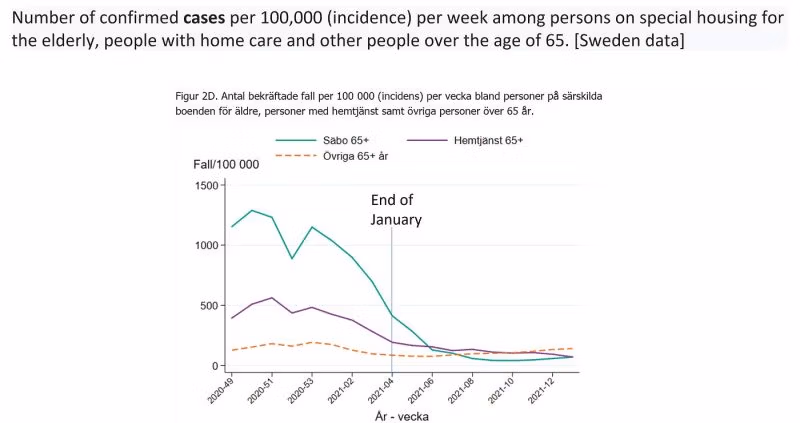 Ovo je možda najbolji primjer kritičara ispranog mozga koji je uvjeren da se svako smanjenje smrtnosti može pripisati ljudskoj intervenciji. Naravno da je postotak opao! Bio je to kraj vala u Švedskoj (Slika 1, smrtnost) i u staračkim domovima (Slika 2, slučajevi). Svi valovi Covida prirodno završavaju.
