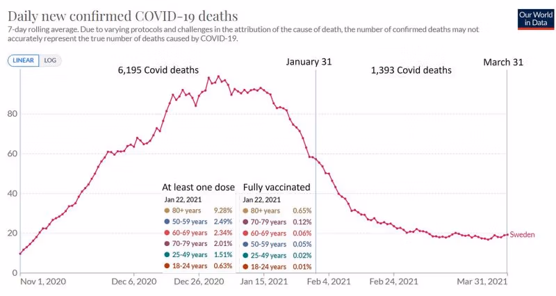 Slika 1 prikazuje val smrtnosti od Covida u Švedskoj zimi 2020. – 2021., o čemu sam raspravljao u moj članakOd 7,588 prijavljenih smrtnih slučajeva od Covida, 6,195 (preko 80 posto) dogodilo se do 31. siječnja, prije ikakvog mogućeg, značajnog učinka kampanje cijepljenja: Naravno, nijedna smrt nije se mogla spriječiti prije nego što je prva osoba cijepljena, oko 27. prosinca, ali ni u siječnju se nije mogao spriječiti značajan broj smrtnih slučajeva.