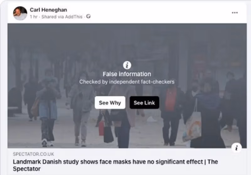 U studenom 2020. Facebook je označio jedan od naših članaka objavljenih u Gledalac kao potencijalnu dezinformaciju s objašnjenjem: „Neovisni provjeravatelji činjenica pregledali su informacije i rekli da im nedostaje kontekst te da bi mogle zavarati ljude.“ Zatim su uključili poveznicu na tajanstveni web stranicu pod nazivom HealthFeedback.org, jedna od skupina samozvanih cenzora i lovaca na vještice koje su koristili.