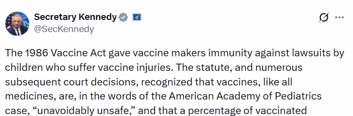 Nacionalna rasprava o šteti od cjepiva i odgovornosti se vratila - ovaj put iz krugova vlasti. Dana 28. srpnja, ministar zdravstva i socijalne skrbi Robert F. Kennedy Jr. oštro je kritizirao Nacionalni program naknade štete od cjepiva (VICP), nazvavši ga močvara neučinkovitosti, favoriziranja i otvorene korupcijeNjegova izjava slijedi desetljeća kritika istraživača, zagovornika pacijenata i obitelji ozlijeđenih koji su gledali kako se program udaljava od svoje izvorne misije: brzo i pravedno obeštetiti one koji su ozlijeđeni cjepivima, u zamjenu za zaštitu proizvođača od tužbi.